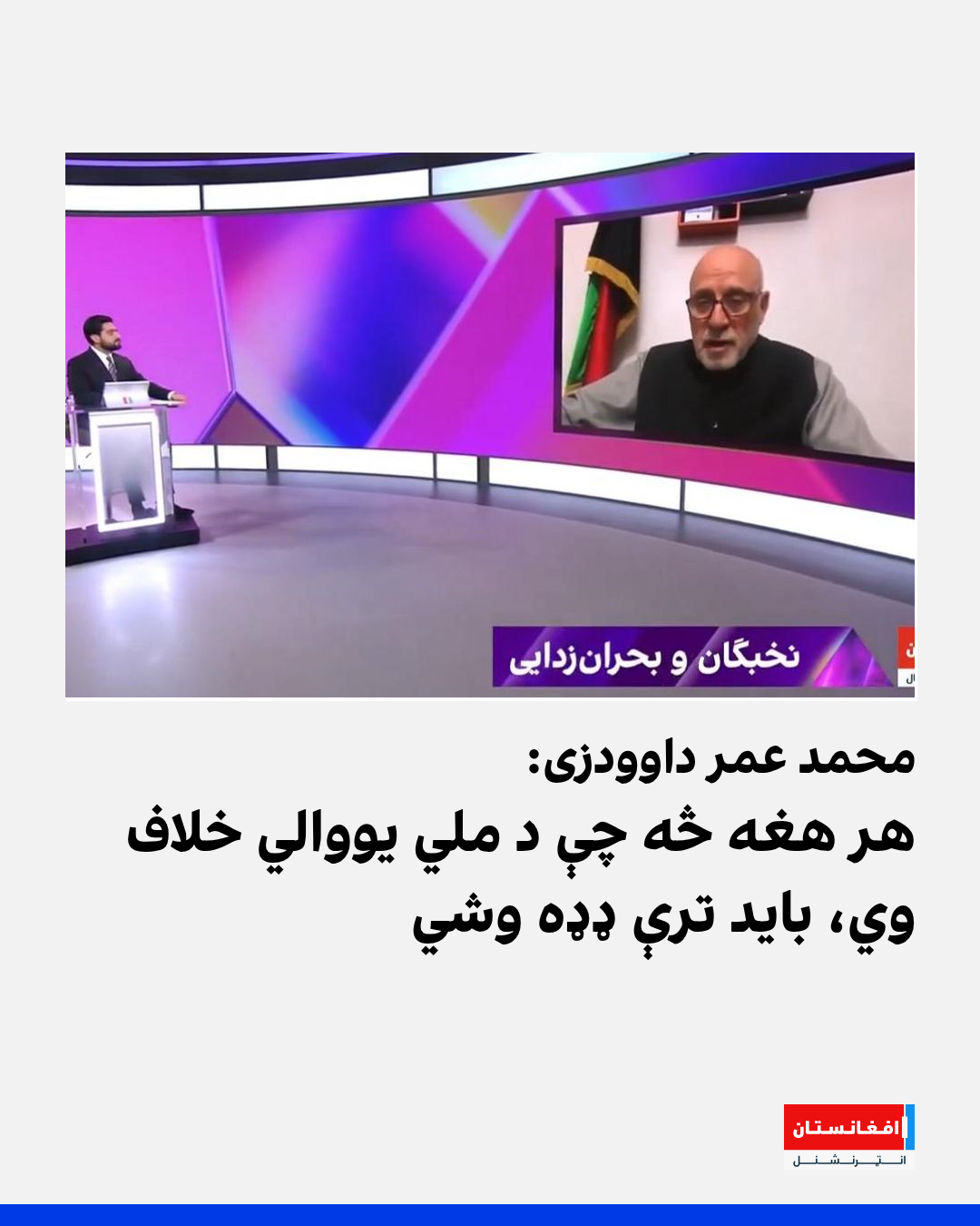عمر داوودزي له افغانستان انټرنشنل سره په خبرو کې ویلي، چې د قومي بحثونو پرځای دې له اوسني ناورین څخه د افغانستان وتلو ته لومړیتوب ورکړل شي او د افغانستان سیاسیون باید د ملي یووالي لپاره اغېزمن ګامونه پورته کړي.