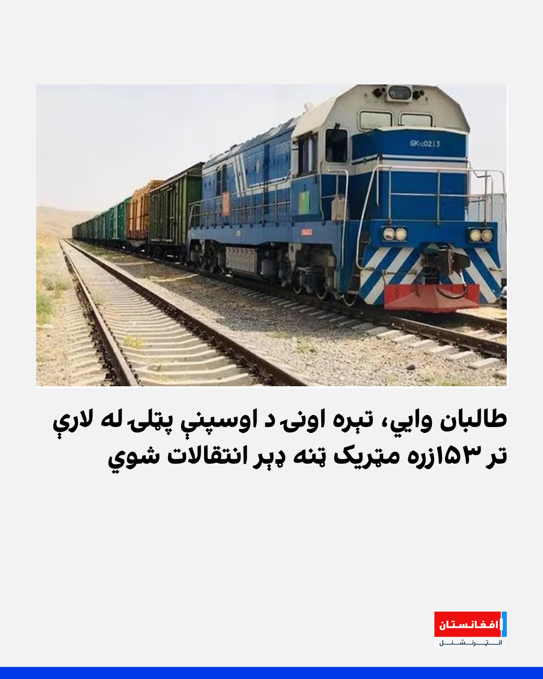 د طالبانو د ټولګټو چارو وزارت خبر ورکړی، په تېره یوه اونۍ کې د افغانستان د اوسپنې پټلۍ له لارې په ټولیز ډول ۱۵۳زره او ۳۹۳ مټریک ټنه انتقالات شوي چې پهکې تېل او نور سوداګریز توکي شامل دي. د معلوماتو له مخې؛ په دې کې ۶۳ټنه سوداګریز توکي او په ځانګړې توګه د انارو جوس صادر شوي.
