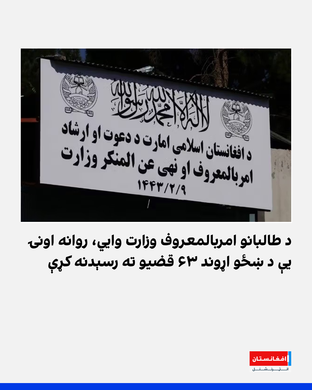 د طالبانو د امر بالمعروف، نهې عن المنکر او شکایتونو اورېدو وزارت وایي، چې د دغه وزارت محتسبانو په روانه اونۍ کې د ښځو د حقونو اړوند ۶۳ قضیو ته رسېدنه کړې ده. د دغه وزارت په خبرپاڼه کې راغلي، چې په همدې موده کې ۲۴۸ رواني ناروغان روغتیايي مرکزونو ته معرفي شوي او ۹ کوډګر نیول شوي.